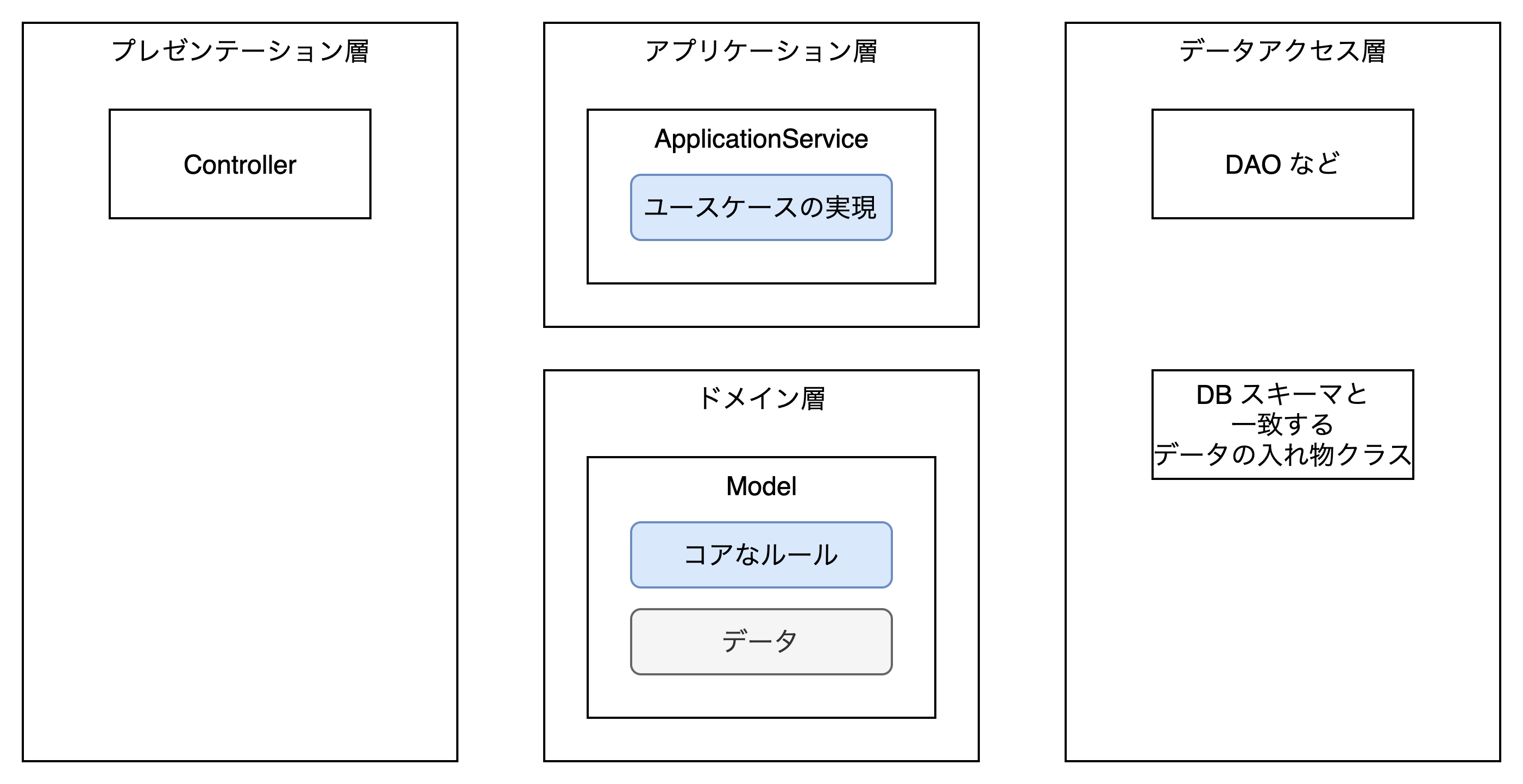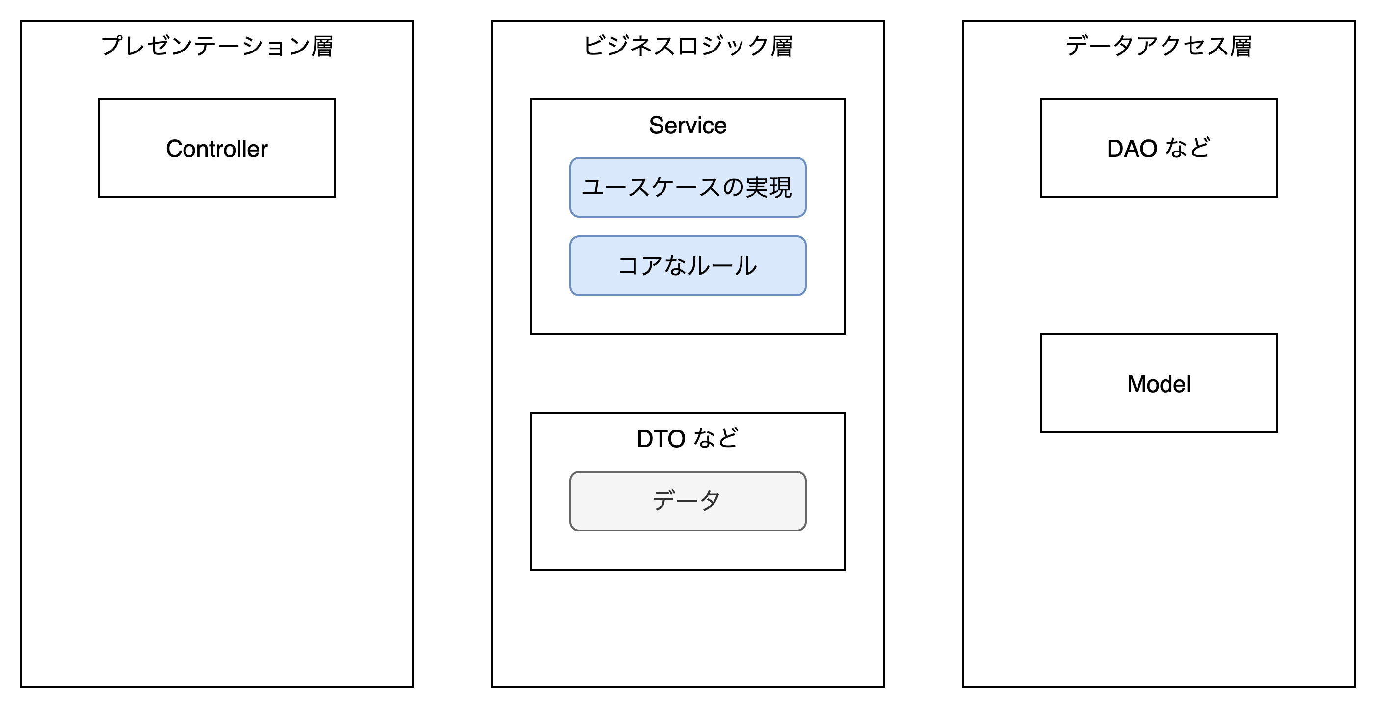 Spring Framework などではこの「サービス」を設けるのが一般的だと思います。 一方で、Ruby on Rails などでは、典型構成としてはこの「サービス」は使わないことが多く、その役割も Controller に持たせてしまう実装をよく見ます。