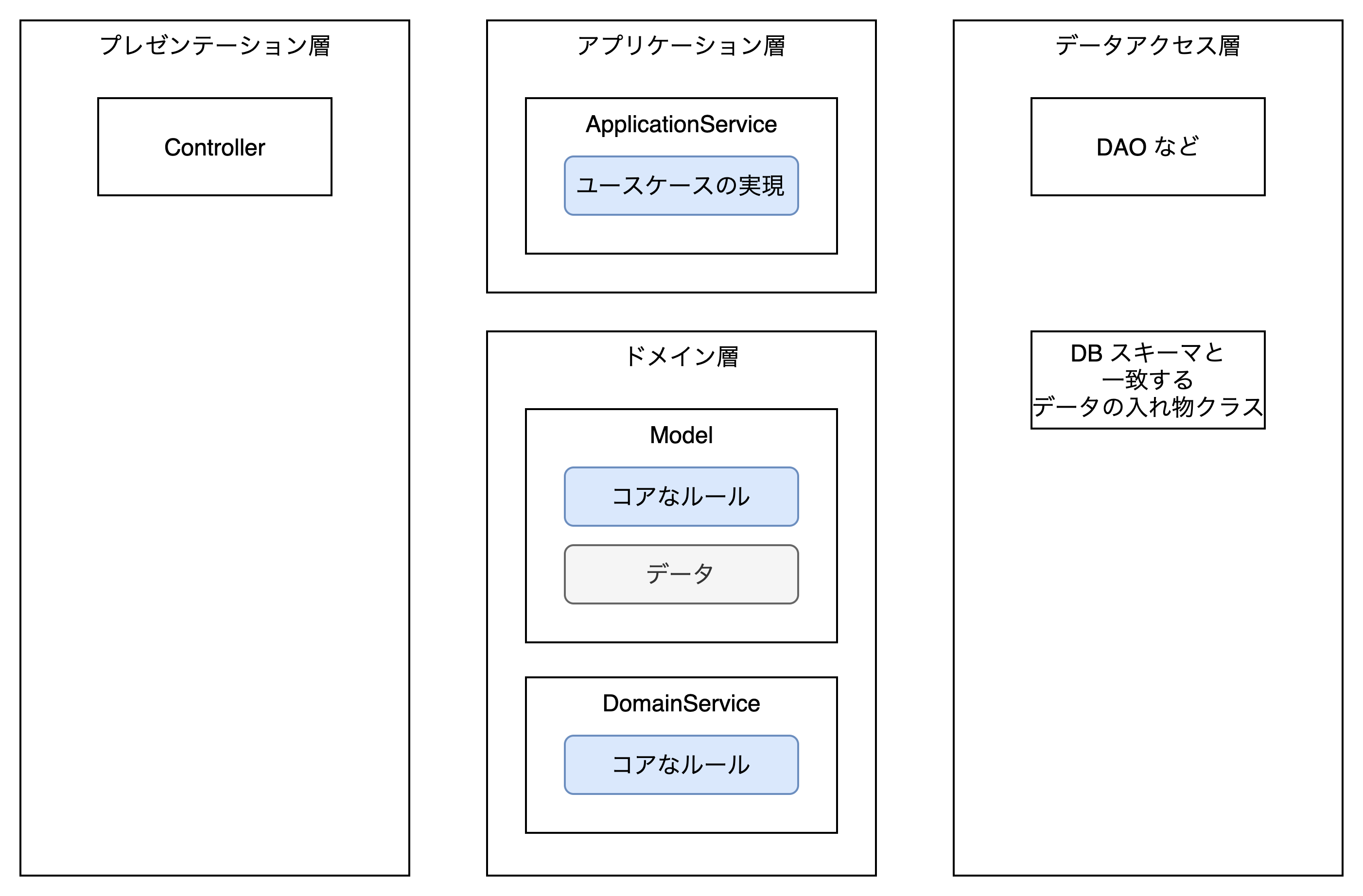 ※ ドメインモデルパターンでは、ビジネスロジック層を「アプリケーション層」と「ドメイン層」に分割したりするので、この図でもそのように表現しています。